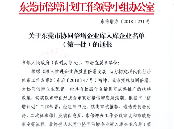 热烈庆祝骏青纳入东莞市2018年“协同倍增”企业库